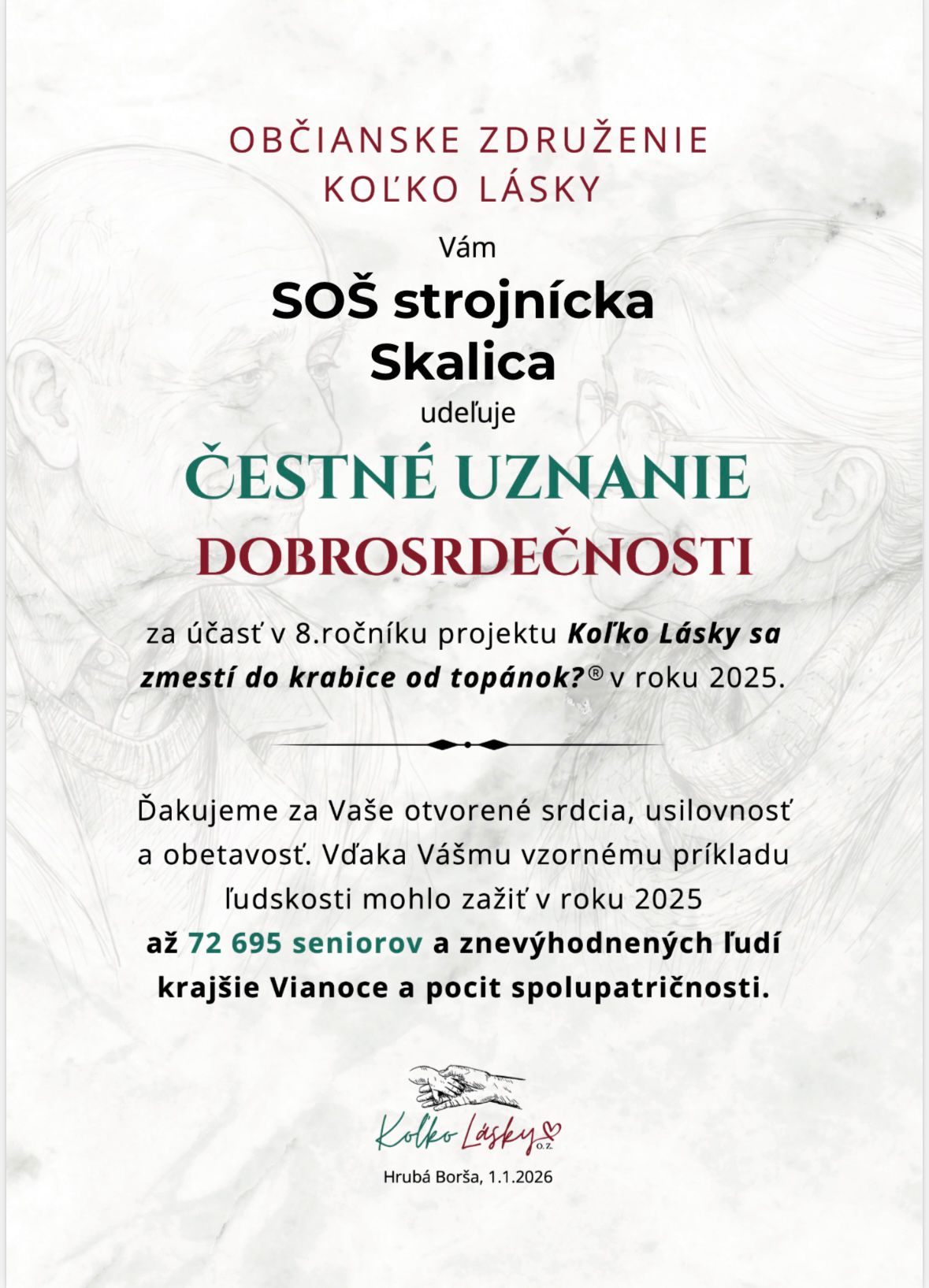 Ako poďakovanie za zapojenie do tejto iniciatívy sme od organizátorov získali Čestné uznanie dobrosrdečnosti, ktoré si veľmi vážime.
